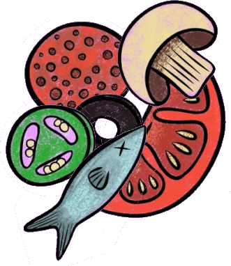 Tomatenschijfjes zijn bijvoorbeeld gewoon ronde rode cirkels, courgetteschijfjes lijken op halve groene cirkels, enzovoort.