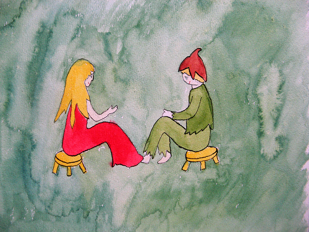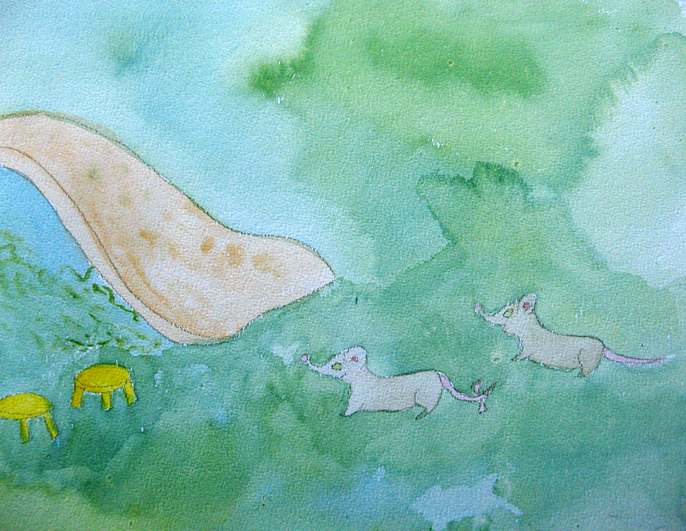 Beukennootje maakte weer hangmatjes van grashalmen. Hij was wel treurig, want al zijn gereedschap en dingen had hij niet mee kunnen nemen. Winterkoninkje ging ze halen. Hij pikte ze gewoonweg voor de neus van Muis weg. De muizen hadden inmiddels wel een miljoen kinderen, zei hij. Maar Winterkoninkje kon niet zo goed tellen. |