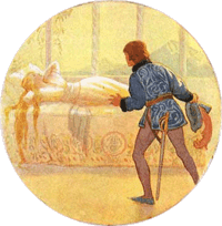 En zonder verder een woord te spreken, draaide ze zich om en verliet de zaal. Allen waren geschrokken, doch de twaalfde fee, die haar toverspreuk ook nog niet bij de elf vorige had gevoegd, trad naar voren, en omdat ze de boze voorspelling niet ongedaan kon maken maar alleen verzachten, sprak ze: "Maar het zal niet de dood zijn, de koningsdochter treft, doch een honderdjarige slaap."