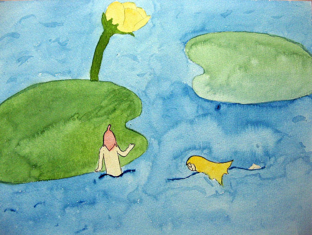 | Dat wisten Beukennootje en Kersenpitje eigenlijk niet. Kikker deed het voor, en voorzichtig probeerden Kersenpitje en Beukennootje het ook eens. Het was niet moeilijk vonden ze, maar ze klommen toch al snel terug op het plompeblad. Het water was nog veel te koud vonden ze. Gauw hun warme kleertjes weer aan! |