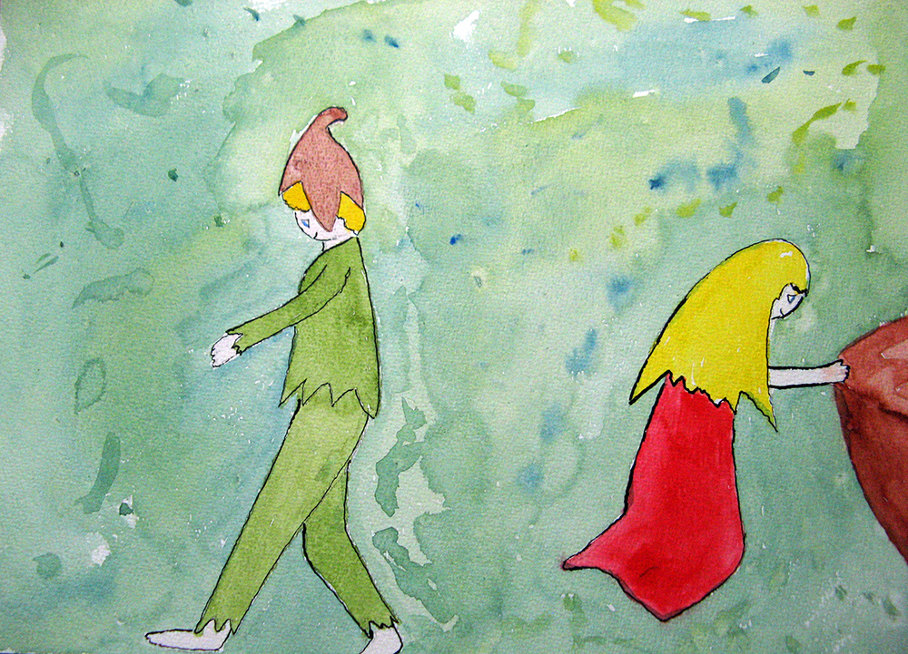 Toen het droog was namen ze afscheid. Moeder Eend kwam nog even kijken naar Dopje, samen met de nieuwsgierige jongen. Goede reis, riep ze. Kersenpitje en Beukennootje zetten hun reis voort, dagen zwierven ze rond. Als de nacht viel legden ze aan en sliepen in de hangmatjes die Beukennootje vlocht. |