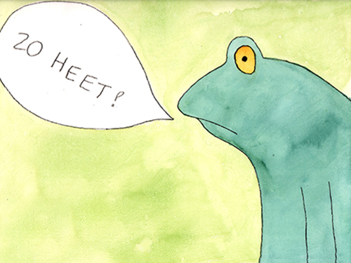 Klaas de Kikker had zijn been gebroken en kon daarom niet zwemmen.
